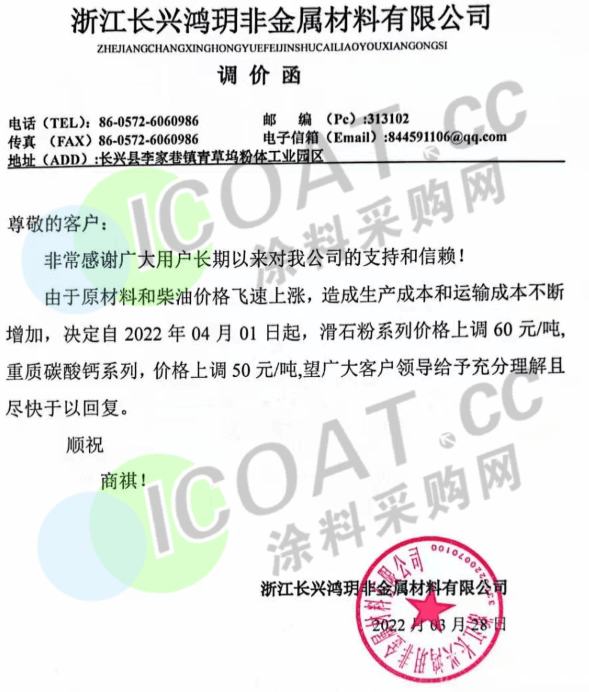 近日,浙江长兴鸿玥非金属材料有限公司发布调价函,称由于原材料和柴油价格飞速上涨,造成生产成本和运输成本不断增加,决定自4月1日起,滑石粉系列价格上调60元/吨,重质碳酸钙系列价格上调50元/吨。