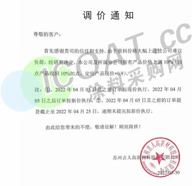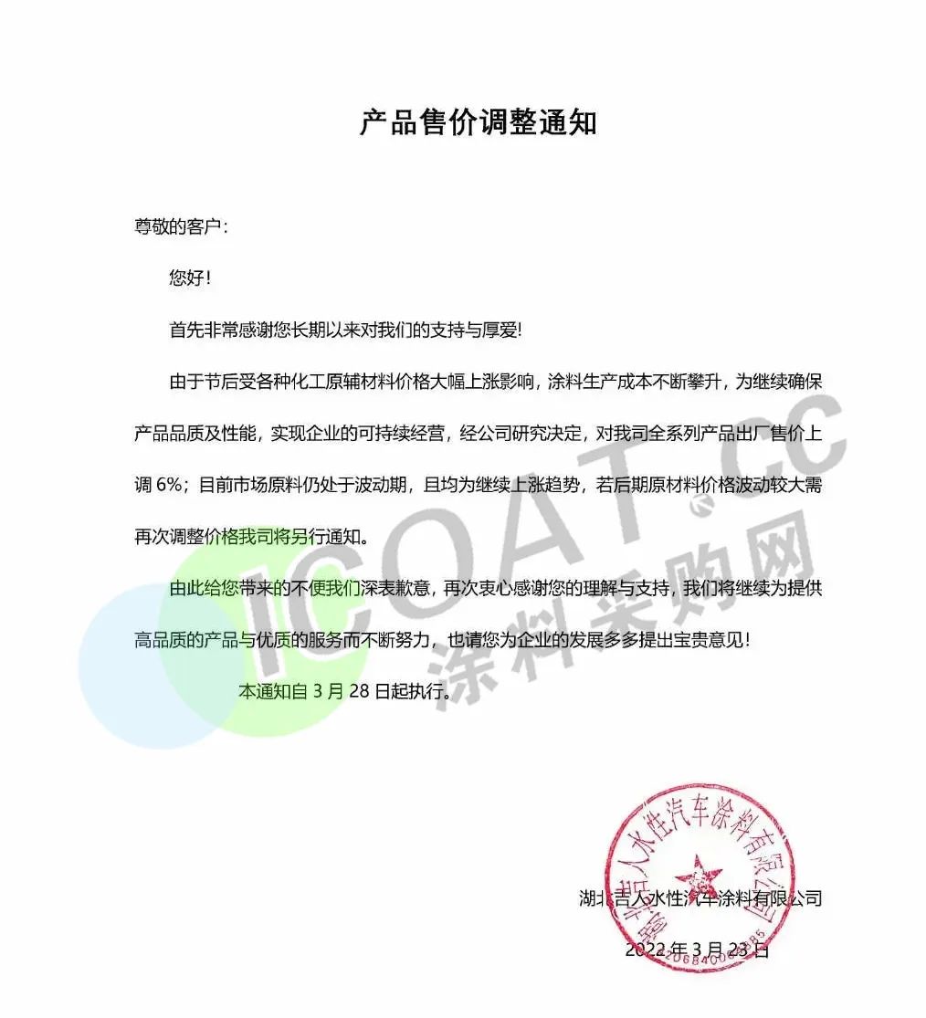 而在一周之前,吉人涂料曾发布产品调价通知,称3月28日起,全系列产品出厂售价上调6%。