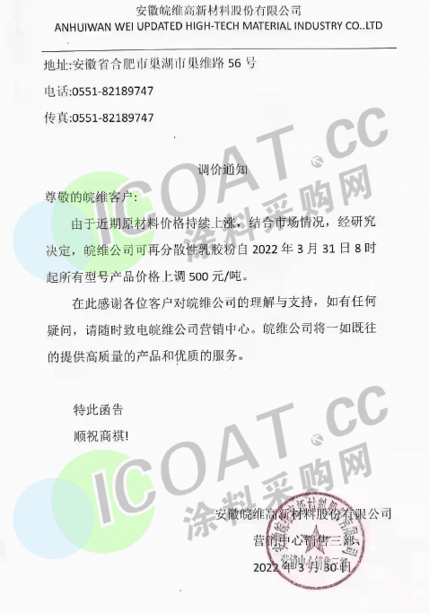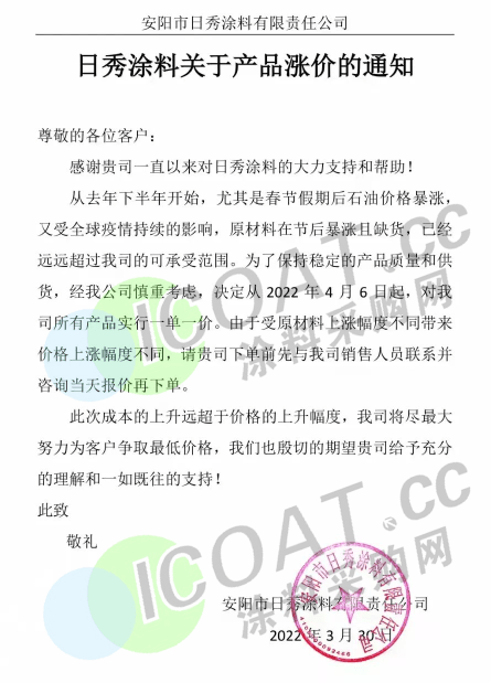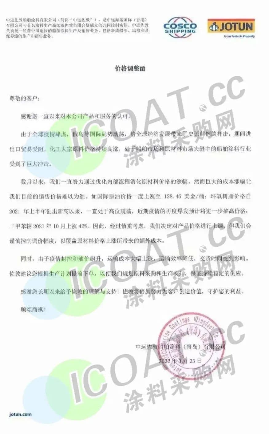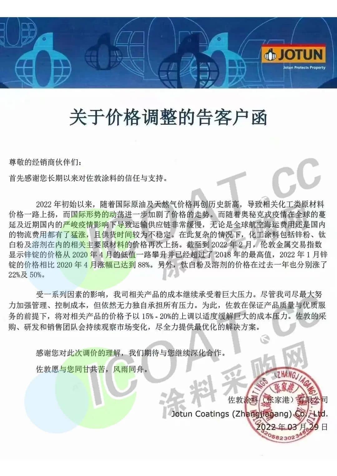 除此之外,佐敦涂料也于近期连发两函宣涨。佐敦涂料(张家港)有限公司表示,将对相关产品的价格予以15%—20%的上调,以适度缓解巨大的成本压力。