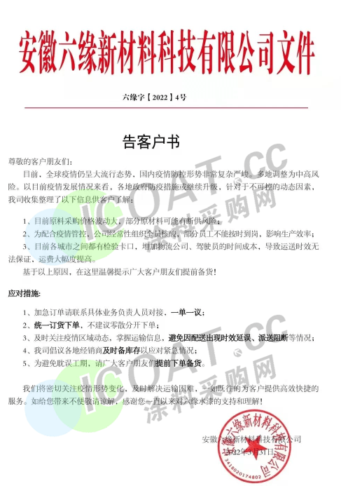 安徽六缘新材料:加急订单一单一议,统一订货下单,建议经销商及时备库存,客户提前下单备货。