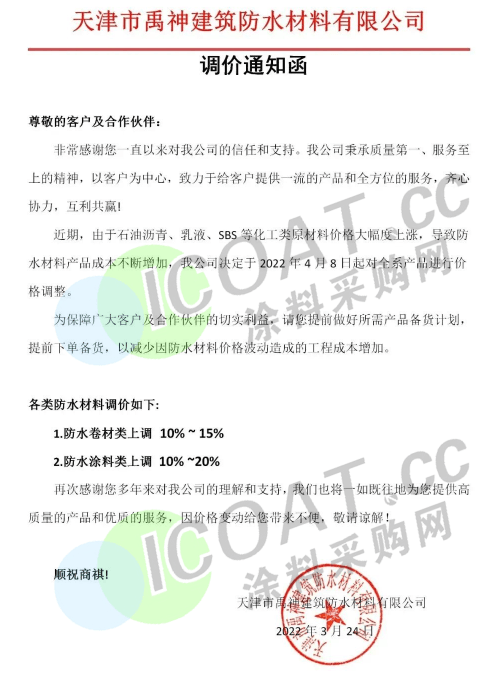 禹神建筑防水材料:4月8日起,防水卷材类上调10%—15%,防水涂料类上调10%—20%。