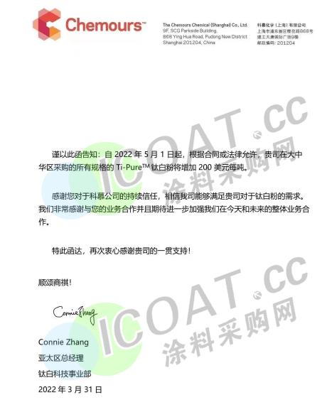 科慕:5月1日起,大中华区采购的所有钛白粉上涨200美元/吨。