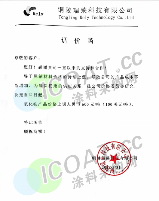 铜陵瑞莱科技有限公司:3月31日起对氧化铁产品价格上调人民币600元/吨(100美元/吨)。