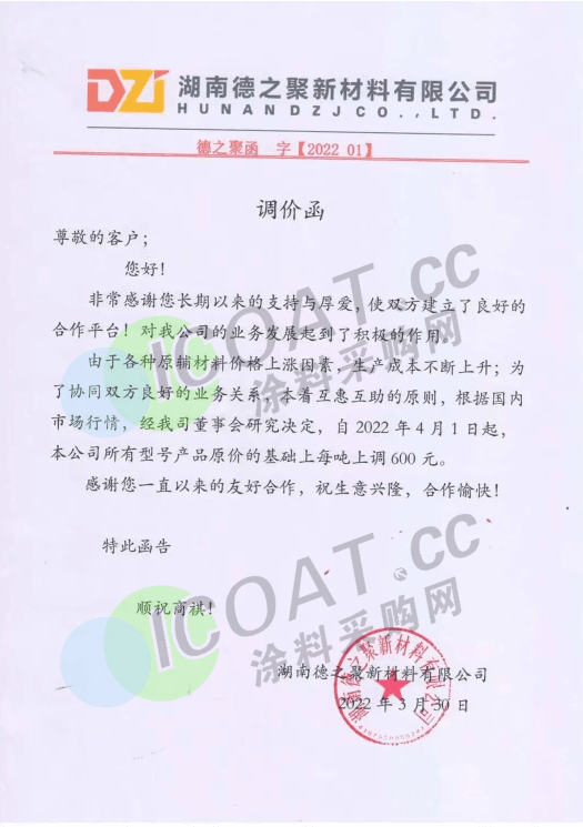 湖南德之聚新材料:4月1日起,所有型号产品原价的基础上每吨上调600元。