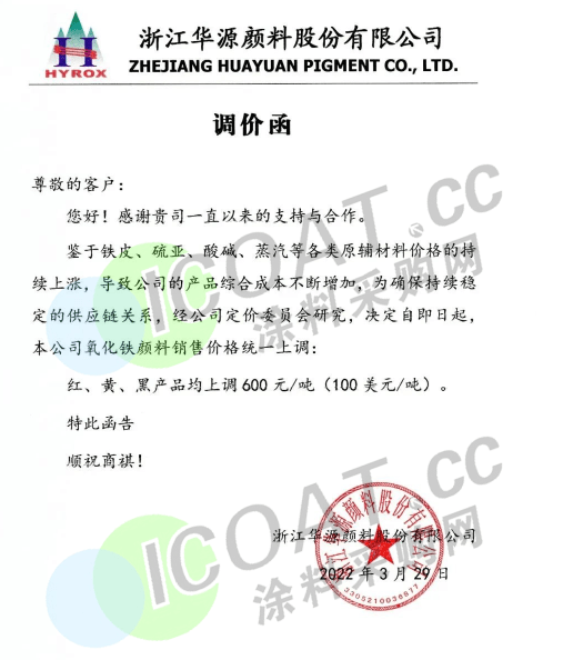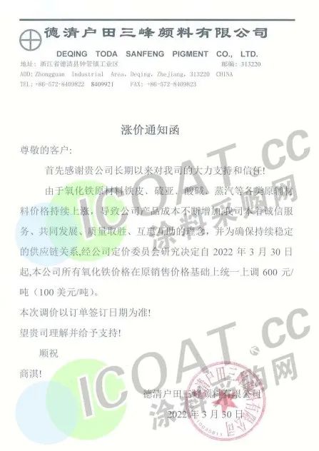 德清户田三峰颜料:3月30日起,所有氧化铁价格在原销售价格基础上统一上调600元/吨(100美元/吨)。