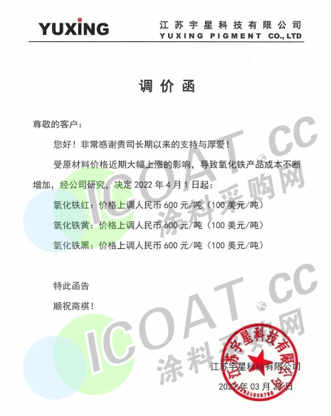 江苏宇星科技:4月1日,氧化铁红、氧化铁黄、氧化铁黑价格上调600元/吨(100美元/吨)。
