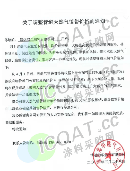 双江颜料:企业收到了清远港华燃气有限公司的通知,4月1日起,天然气销售综合单价暂时按照4.93元/m³预收预结,最终结算价格由上游企业确定其销售价格后,再进行多退少补。企业同时表示,在天然气调涨和综合成本压力之下,企业产品有调涨计划。