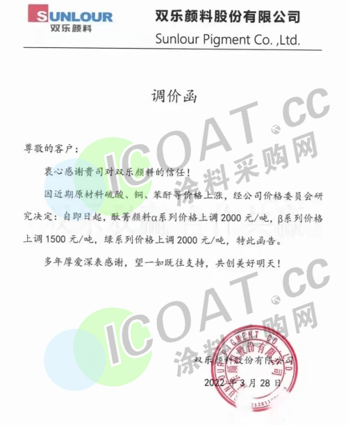 双乐颜料:即日起,酞菁颜料α系列价格上调2000元/吨,β系列价格上调1500元/吨,绿系列价格上调2000元/吨。