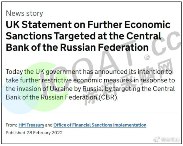 英国:英国财政部及英国央行宣布,“将与美国及欧盟一起”(in concert with the US and the European Union),对俄罗斯联邦中央银行实施制裁,禁止任何英国实体与俄罗斯央行、俄罗斯联邦财政部、俄罗斯国家财富基金进行交易。