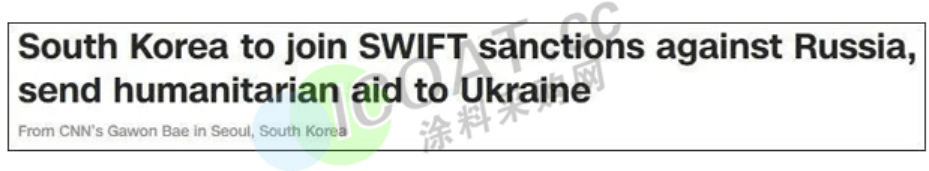 韩国:韩国外交部表示,韩国将禁止向俄罗斯出口战略物资,并加入禁止部分俄罗斯银行使用环球银行金融电信协会(SWIFT)国际结算系统的制裁。