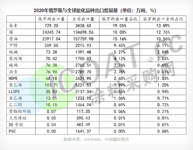 对于整个化工产业链上的原料来说,更是影响巨大。俄罗斯在化工出口方面,尿素出口量729.2万吨,在全球出口量占比达到了19.05%,而甲醇出口量为209.5万吨,在全球出口量占比为9.45%。由于乌克兰局势持续恶化,俄罗斯被进一步制裁的程度很可能提高,这将会对全球能化市场产生较大影响。
