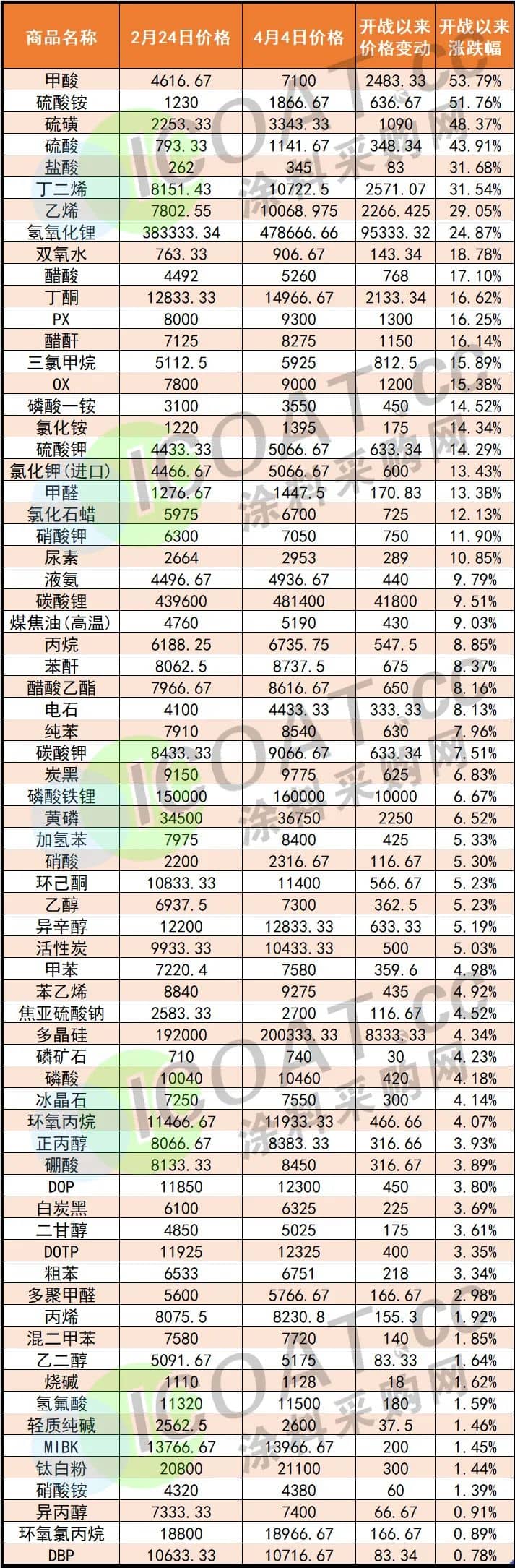 而在错综复杂的化工产业链上,任何一种化工品供应和价格的变动都会造成牵一发而动全身的连锁反应,这也就解释了自2月24日开战以来,国内化工市场70余种化工品火速上涨,且部分产品涨幅超过50%的原因了。