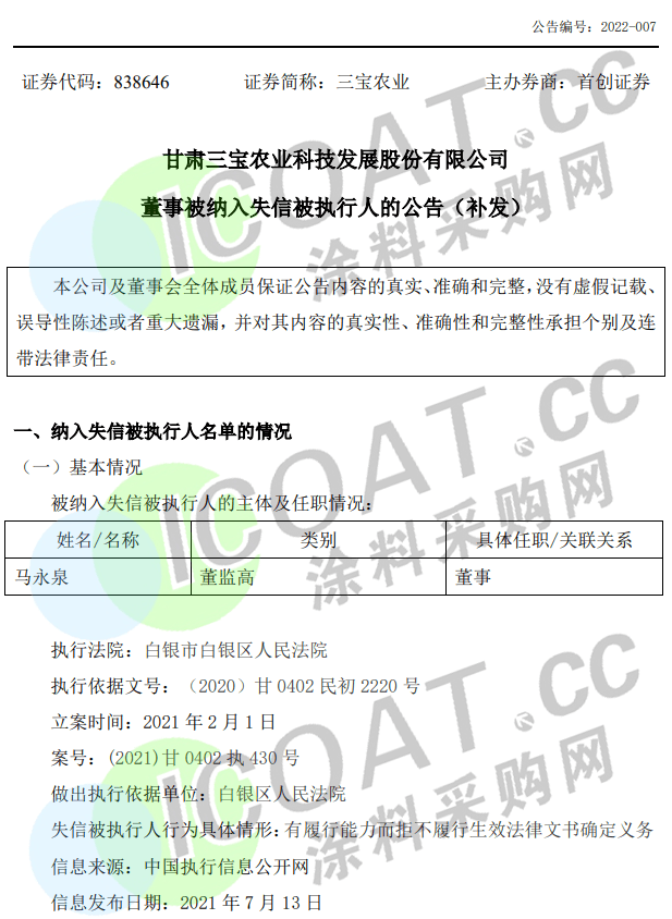 近日,农业产业化龙头上市公司三宝农业发布了《董事被纳入失信被执行人的公告》,称董事马永泉因有履行能力而拒不履行生效法律文书确定义务,被白银市白银区人民法院纳入失信被执行人。
