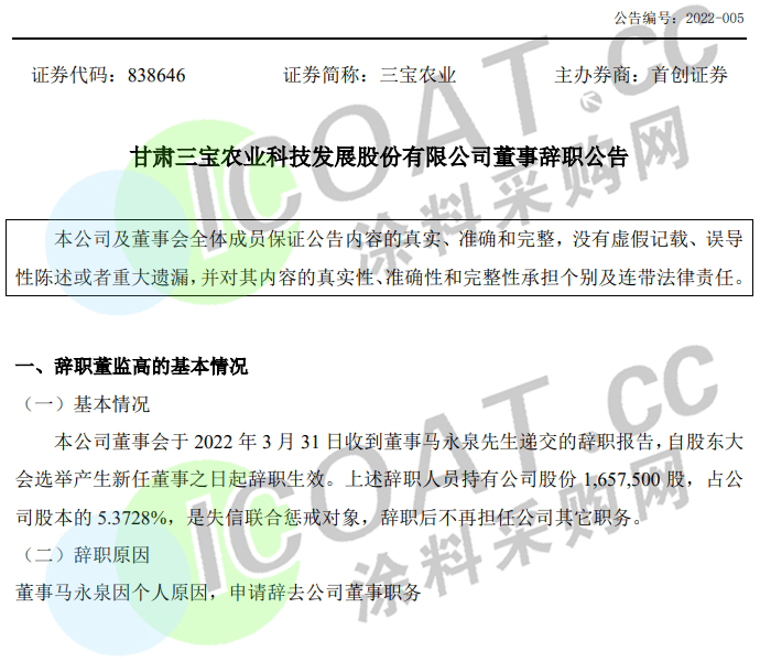 而在此前,三宝农业曾发布公告,称董事会收到董事马永泉先生递交的辞职报告,自股东大会选举产生新任董事之日起辞职生效。上述辞职人员持有公司股份1,657,500股,占公司股本的5.3728%,是失信联合惩戒对象,辞职后不再担任公司其它职务。