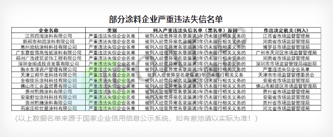据国家企业信用信息公示系统数据信息,江西四海涂料、惠州欣航涂料、全椒佳乐涂料等多家涂料企业因“被列入经营异常名录届满3年仍未履行相关义务”等原因,被当地市场监管局列为严重违法失信企业。这些企业会被列为重点监督管理对象,不予通过“守合同重信用”企业公示活动申报资格审核,不予授予相关荣誉称号。另外,其法定代表人、负责人,3年内不得担任其他企业的法定代表人、负责人,可谓是发展受限、生存艰难。