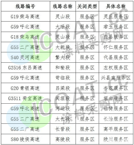 山西省共临时关闭收费站19处,服务区13处。其中太原市5处,大同市1处;朔州市3处;忻州市3处;晋中市1处;吕梁市3处;临汾市5处;运城市6处;长治市2处;晋城市3处。