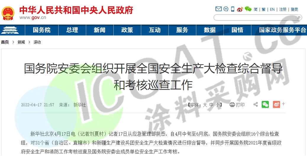 近日,国务院安委会宣布,自4月中旬至6月底,国务院安委会组织16个综合检查组,对31个省(自治区、直辖市)和新疆生产建设兵团安全生产大检查情况进行综合督导,并同步开展国务院2021年度省级政府安全生产和消防工作考核巡查及国务院安委会成员单位安全生产工作考核。