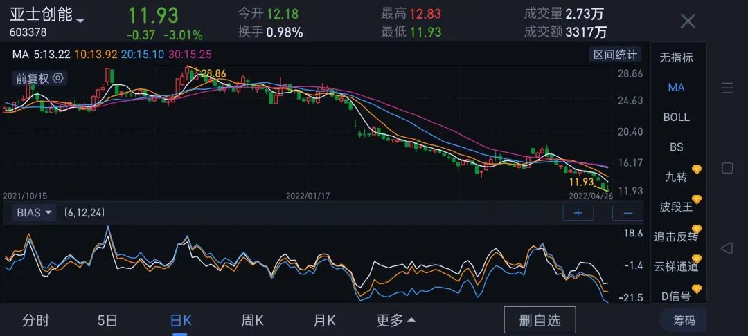 亚士创能股价下跌4.79元,跌幅28.03%,市值蒸发14.3亿元;