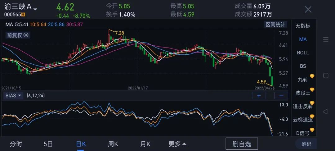 渝三峡A股价下跌1.03元,跌幅16.91%,市值蒸发4.5亿元;