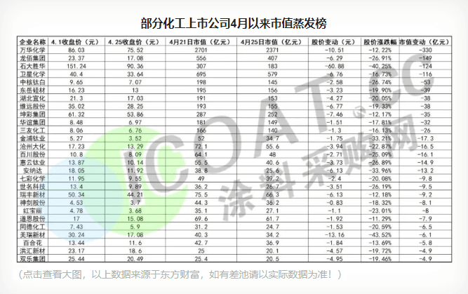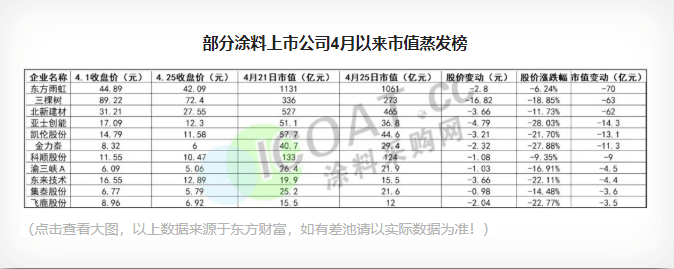 据涂料采购网不完全统计,4月初至25日,11家涂料上市公司出现了股价下跌的情况,其中三棵树股价下跌16.82元,比科顺股份、凯伦股份、金力泰等多家涂料上市公司25日股价还要高。而在以上11家涂料行业上市公司中,东方雨虹、BETVLCTOR伟德国际网页版 、北新建材市值蒸发超过50亿,其中东方雨虹以70亿元的“优势”位列市值蒸发榜榜首,70多亿的缩水量比凯伦股份、亚士创能和金力泰的目前的市值还要高,相当于3个渝三峡、集泰股份,4个东来技术,5个飞鹿股份的身价,涂料板块市值蒸发合计258.7亿元。