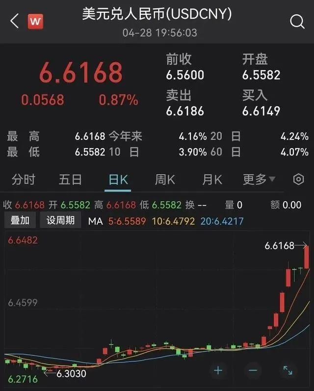 而在此前一日(28日),在岸人民币对美元盘中一度跌破6.61关口,日内跌逾400个基点,创下2020年12月以来的新低。离岸人民币一度跌破6.65,日内贬值近700点,创下了2020年11月以来的新低。截至北京时间4月28日13:30,人民币对美元汇率跌破6.6报6.6075,离岸人民币贬至6.6468,年初至今分别贬值约3.9%和4.6%。