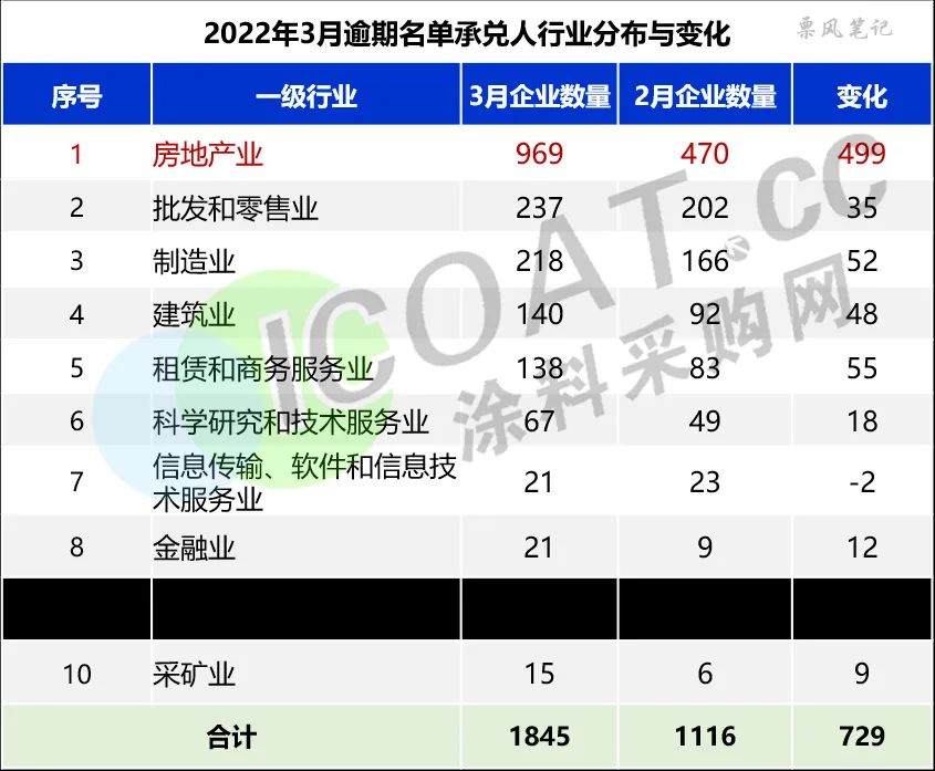 据上海票交所公布的截至2022年3月31日的商票持续逾期名单可以看出,名单上企业合计1904家,企业名称中带“地产”、“置业”的企业就达到942家,房地产相关企业可谓是商票逾期的重灾区,这还不包括建筑、装饰、工程等相关企业。此外,建筑业、租赁和商务服务业两个房地产相关行业商票逾期企业数量也保持高增长。