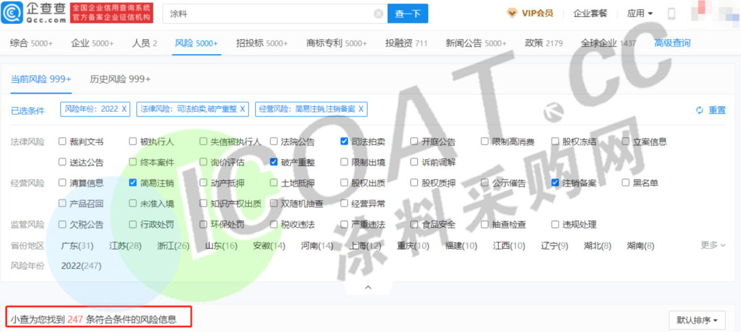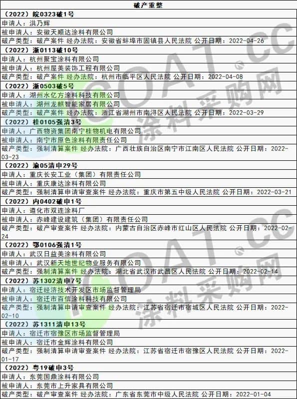 据涂料采购网不完全统计,年初至4月底,涂料企业(含涂料制造、销售等名称中包括“涂料”关键词的企业)出现司法拍卖、破产重整、注销等风险的企业超过200家,他们目前已经是一只脚迈进了“注销”的大门,尽管公司状态栏还挂着“存续”二字,但距离彻底销声匿迹只有一步之遥。