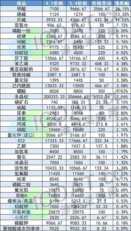 近一个月部分化工原材料价格变动表