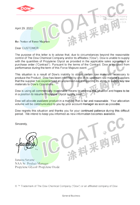 近日,陶氏发布紧急通知称,某上游原材料企业受到其供应商意外事故影响,中断了向陶氏业务供应关键原材料的能力。受此影响,陶氏的丙二醇供应宣布不可抗力,恢复时间后续通知。
