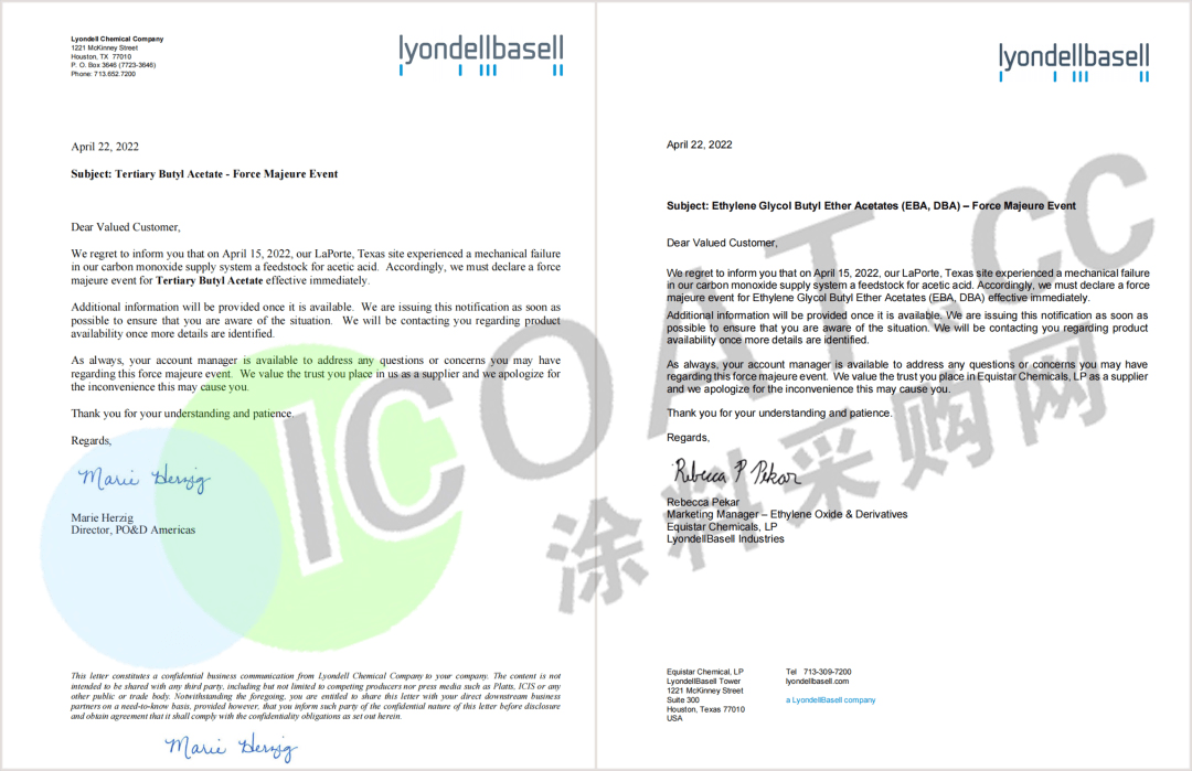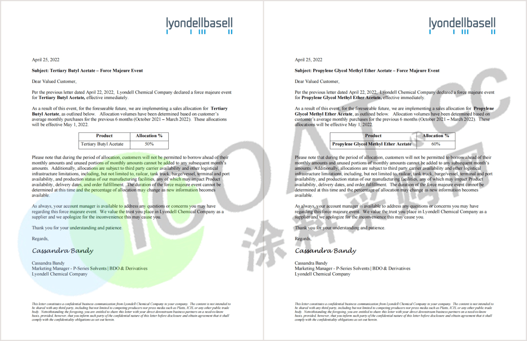 4月22日,利安德巴赛尔宣布醋酸叔丁酯、乙二醇乙醚醋酸酯(EBA,DBA)等产品发生不可抗力。而后利安德巴赛尔连发配额销售通知,称公司正在实施醋酸叔丁酯、丙二醇甲醚醋酸酯等产品的销售分配,分配量是根据客户过去6个月(2021年10月-2022年3月)的平均月购买量确定的,该计划于2022年5月1日起生效。目前无法确定不可抗力事件的持续时间,分配的百分比可能会随着新信息的出现而改变。