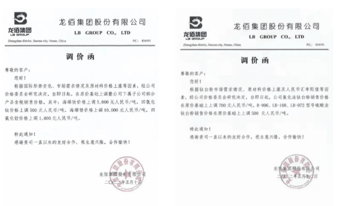 五一假期后返市,钛白粉主流价格持稳运行,部分生产商出现小幅度弱势,而实单价格正是为了稳定市场,常规行情波动而已,不用赋予其过多的“使命感”,只是市场的供需情况所致。实质上,现阶段更多市场人士和终端用户更加关注龙企的价格走势,其目前出货状态稳定,尤其是出口订单很好,其海绵钛、四氯化钛等部分产品先行宣涨,幅度在500-5000元/吨,紧接着氯化法钛白粉宣涨700元/吨、硫酸法部分产品独立调涨500元/吨。涨价函如图。