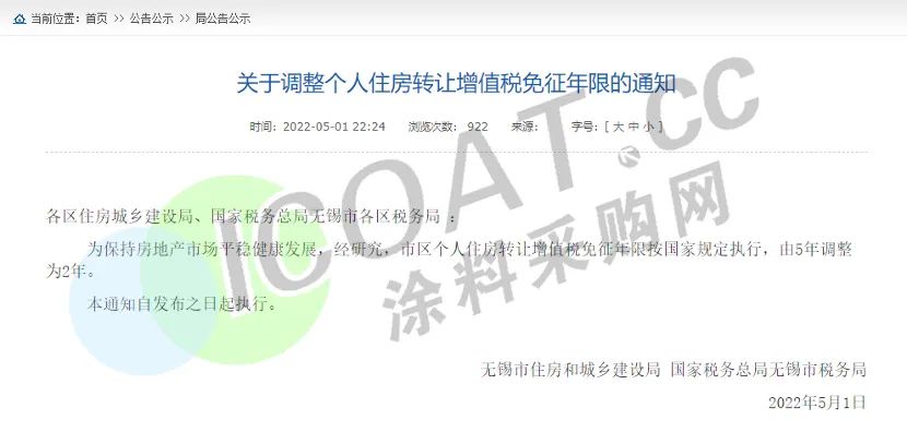 无锡市住房和城乡建设局、国家税务总局无锡市税务局联合下发《关于调整个人住房转让增值税免征年限的通知》。《通知》明确无锡市区个人住房转让增值税免征年限按国家规定执行,由5年调整为2年。