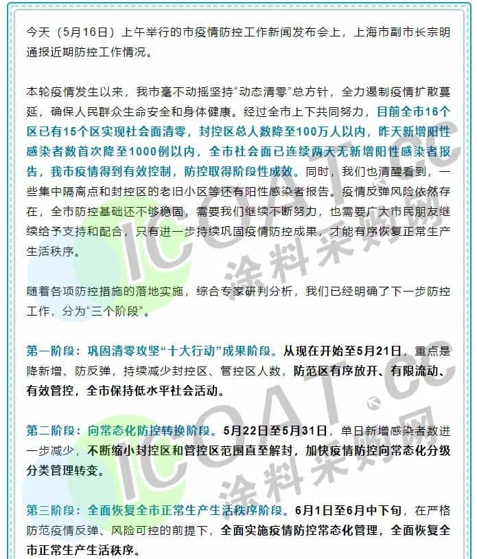 目前,上海已经明确了下一步防控工作,分为“三个阶段”。第一阶段:巩固清零攻坚“十大行动”成果阶段。第二阶段:向常态化防控转换阶段。第三阶段:全面恢复全市正常生产生活秩序阶段,并明确6月1日至6月中下旬,在严格防范疫情反弹、风险可控的前提下,全面实施疫情防控常态化管理,全面恢复全市正常生产生活秩序。