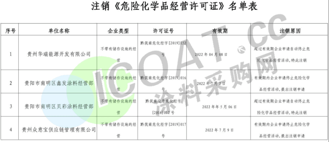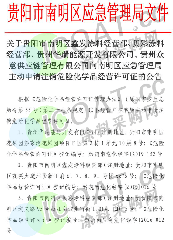 近日,贵州省贵阳市南明区应急管理局发布文件,公布贵阳市南明区鑫发涂料经营部、贝彩涂料经营部等4家企业主动申请注销危险化学品经营许可证。