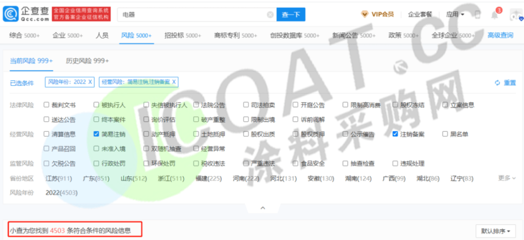 电器行业,2022年以来,正在简易注销、注销备案或是破产重整状态的企业为4503家。