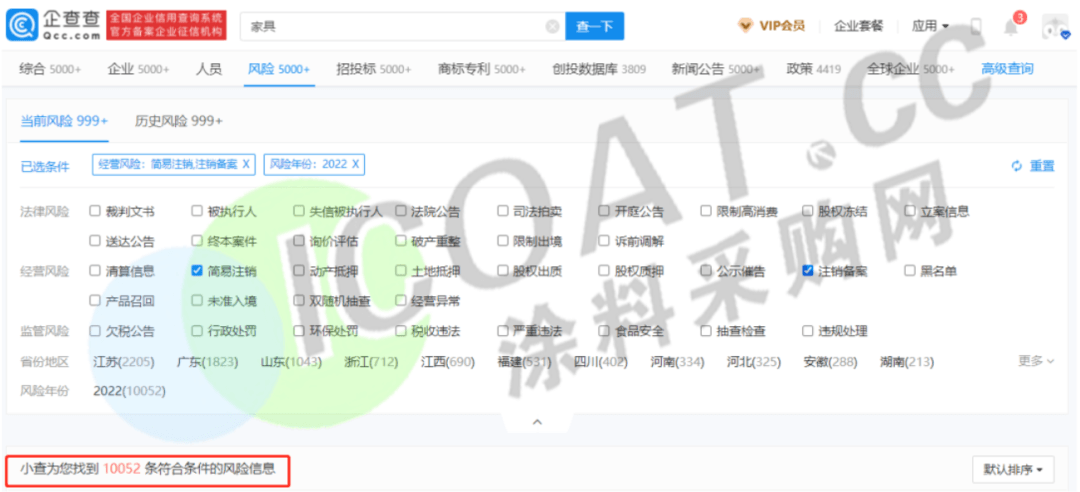 家具行业,2022年以来,正在简易注销、注销备案或是破产重整状态的企业为10052家。