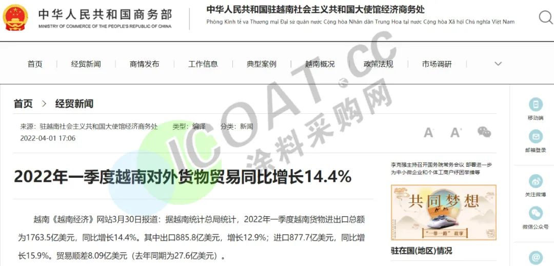 近日,越南地区2022年第一季度进出口数据出炉,火爆态势前所未有。越南货物进出口总额1763.5亿美元,同比增长14.37%。其中出口约885.8亿美元,同比增长12.9%;货物进口约877.7亿美元,同比增长15.9%。同期,深圳市货物贸易进出口7404.8亿元人民币,同比下降2.8%。其中,出口4076. 6亿元,下降2.6%;进口3328.2亿元,下降3.1%。对于越南出口额超过我国制造业珠三角重地——深圳,众多网友纷纷表示惊讶。