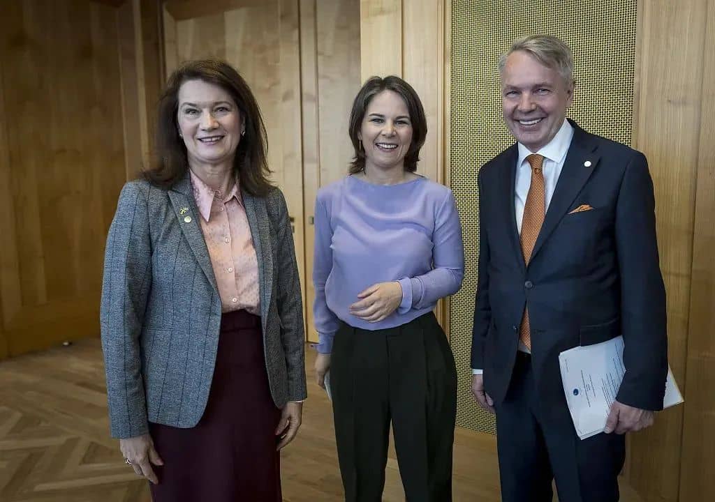 德国外长贝尔伯克(中)、瑞典外交大臣林德(左)、芬兰外长佩卡·哈维斯托在北约非正式外长会期间合影。
