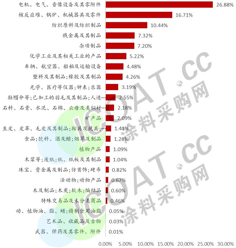 从出口结构上看,中国主要出口产品为工业制成品,占比高达94%。出口分项来看,电机、电气、音像设备及零部件出口额占比达到26.88%,核反应堆、锅炉、机械器具及零件出口额占比达到16.71%,纺织原料及纺织制品出口额占比达到10.44%,贱金属及其制品出口额占比达到7.32%。其他比例较大的包括杂项制品、化工品、塑料及其制品、车辆及运输设备、光学与医疗仪器、鞋帽伞等。而在动植物食品、烟酒饮料等生活食物类的出口占比较小,约为3.1%。