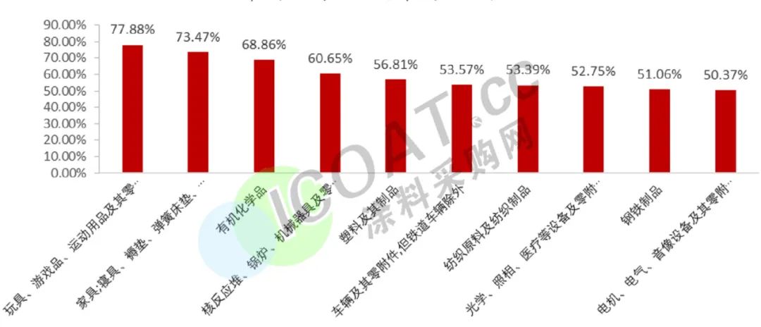 而在化工领域,近10年来,我国化工分类产品的出口金额持续增长,年均增速接近10%。从规模看,有机化学品以及石油、石油产品及有关原料两个分类的出口金额规模最大。出口占比超过30%的产品主要包括橡胶助剂、钛白粉、聚氨酯、染料、磷化工、肥料等产品。尤其是促进剂、防老剂、硫酸铵、磷酸二铵、聚合MDI等产品出口占比较高,达到50%以上。