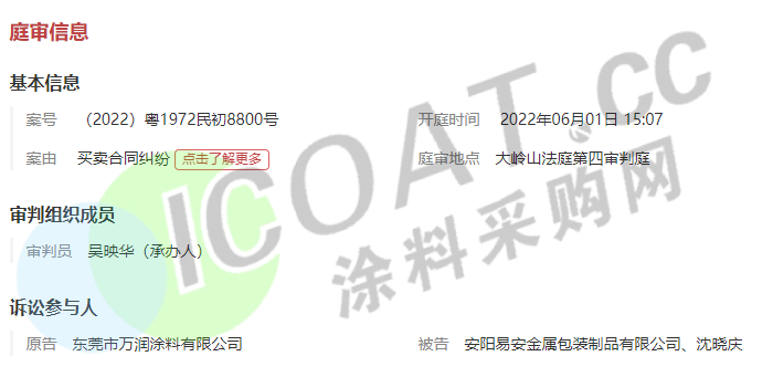 近日,中国庭审公开网信息显示,东莞市万润涂料有限公司与被告安阳易安金属包装制品有限公司、沈晓庆买卖合同纠纷一案于2022年6月1日下午在大岭山法庭第四审判庭开庭。