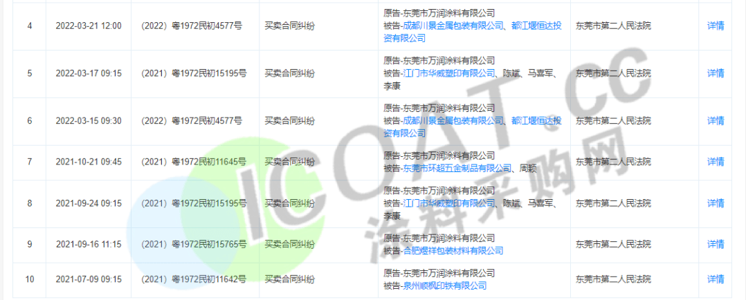 涂料采购网查询得知,东莞市万润涂料近期开庭公告68起,案由多为买卖合同纠纷,被告方涉及了塑印企业、金属包装企业、五金制品企业、投资企业等。