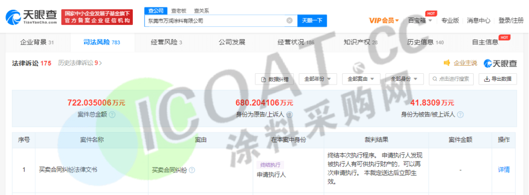 此外,该企业司法风险方面涉及法律诉讼175起,案件总金额超过700万,身份为原告/上诉人的案件总金额为680万。如此众多的法律官司以及巨额的案件金额让人不禁担忧,这家涂料企业是否已经在诉讼中维护了自己的合法权益,涂料行业又是否陷入了多重官司的深渊。