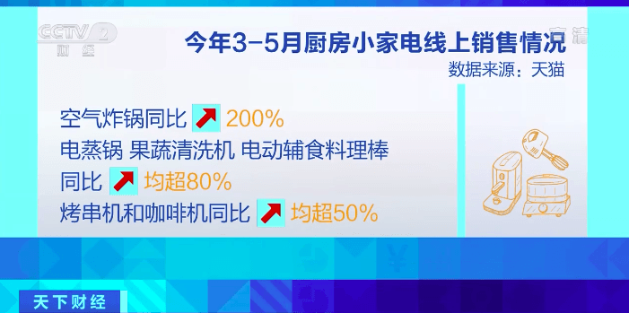 疫情期间,人们出行减少,因此“宅经济”开始火爆发展,间接带火了各种各样的小家电。 今年3-5月,空气炸锅同比增长200%,电蒸锅、果蔬清洗机、电动辅食料理棒同比增长均超过了80%,烤串机和咖啡机同比增长均超过50%。