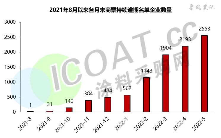 而据相关数据,TOP50房企的应付票据规模在4000亿左右,商票占比在80%以上,对于深陷“黑铁时代”的房地产行业而言,这些票据的背后是重重的危机。据上海票交所公布的截至2022年5月31日的商票持续逾期名单可知,逾期企业合计2553家,较前一个月末增加360家。