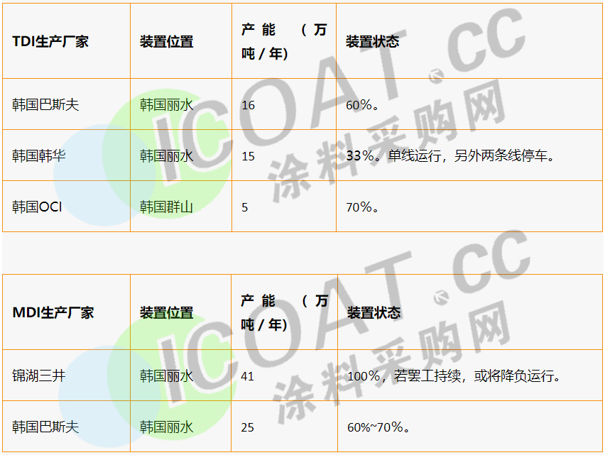 这场罢工直接导致韩国韩华位于丽水的TDI装置降负33%运行,同时巴斯夫位于丽水的TDI和MDI装置降负60%运行。