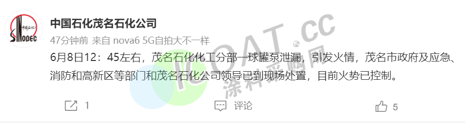 茂名石化化工分部一球罐泵泄漏,导致乙烯裂解装置芳烃单元中间罐着火。此次故障涉及2#裂解装置,目前25万吨/年2#LDPE装置已停车,开车时间待定。