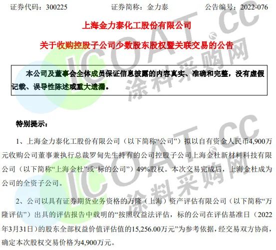 6月9日,金力泰披露,拟以自有资金4900万元收购公司董事兼执行总裁罗甸持有的公司控股子公司上海金杜49%股权。本次交易完成后,上海金杜成为金力泰的全资子公司。
