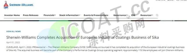4月1日,宣伟宣布已完成对西卡欧洲工业涂料业务的收购,收购的业务将成为公司高性能涂料集团运营部门的一部分。