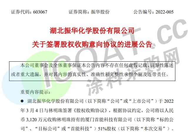 3月7日,湖北振华化学股份有限公司公告称,公司与林明珠签署《股权收购协议》,将以3120万元收购林明珠持有的首能科技51%股权。